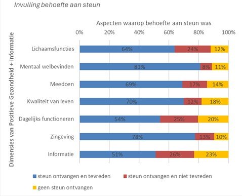 Toch is er een aantal dimensies waar mensen op een groot deel van de aspecten geen steun hebben ontvangen of steun waarover zij niet tevreden waren. Vooral op de dimensies dagelijks functioneren (en dan in het bijzonder vraagstukken rondom werk) en informatie werd maar voor de helft van de aspecten steun naar tevredenheid van de deelnemers gegeven. Voor de andere helft werd ofwel geen steun of steun waarover men niet tevreden was gegeven.