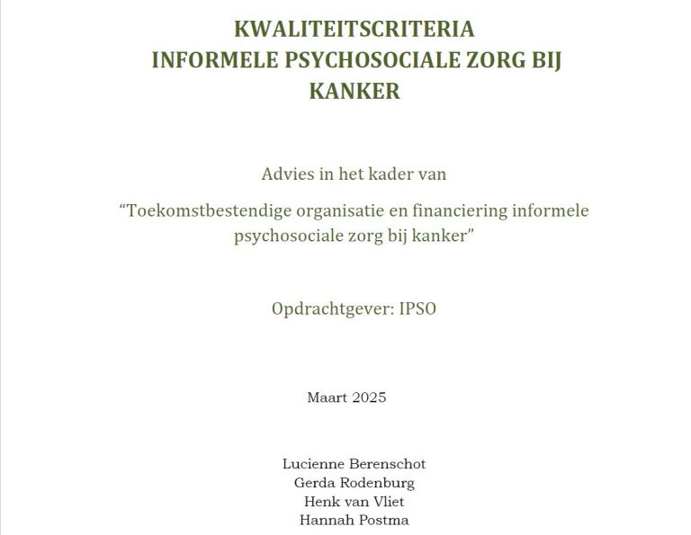 Vrijwillige inzet in de psychosociale zorg bij kanker staat onder druk. Maatschappelijke veranderingen, nieuwe verwachtingen en verschuivende motivaties vragen om een hernieuwde visie. Het rapport ‘Toekomstvisie op het werken met getrainde vrijwilligers in de georganiseerde informele psychosociale zorg bij kanker’ schetst een toekomstbeeld op basis van grondig deskresearch en interviews met experts. Met concrete aanbevelingen voor samenwerking, werving en borging van vrijwilligers, roept het rapport op tot gezamenlijke actie van organisaties in de oncologie, overheid en bedrijfsleven – want vrijwillige inzet is van onschatbare waarde, nu én in de toekomst.